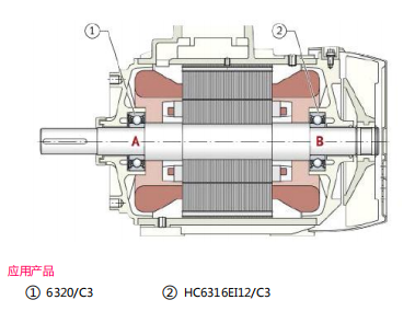 在該感應(yīng)電機(jī)的的風(fēng)扇端使用一套表面噴涂絕緣深溝球軸承 HC6316EI12/C3,驅(qū)動(dòng)端使用一套普 通深溝球軸承 6320/C3,如下圖所示。帶絕緣層的深溝球軸承切斷了沿軸產(chǎn)生的感應(yīng)電壓引起的電流回路,兩端軸承采用脂潤滑,需安裝再潤滑裝置。